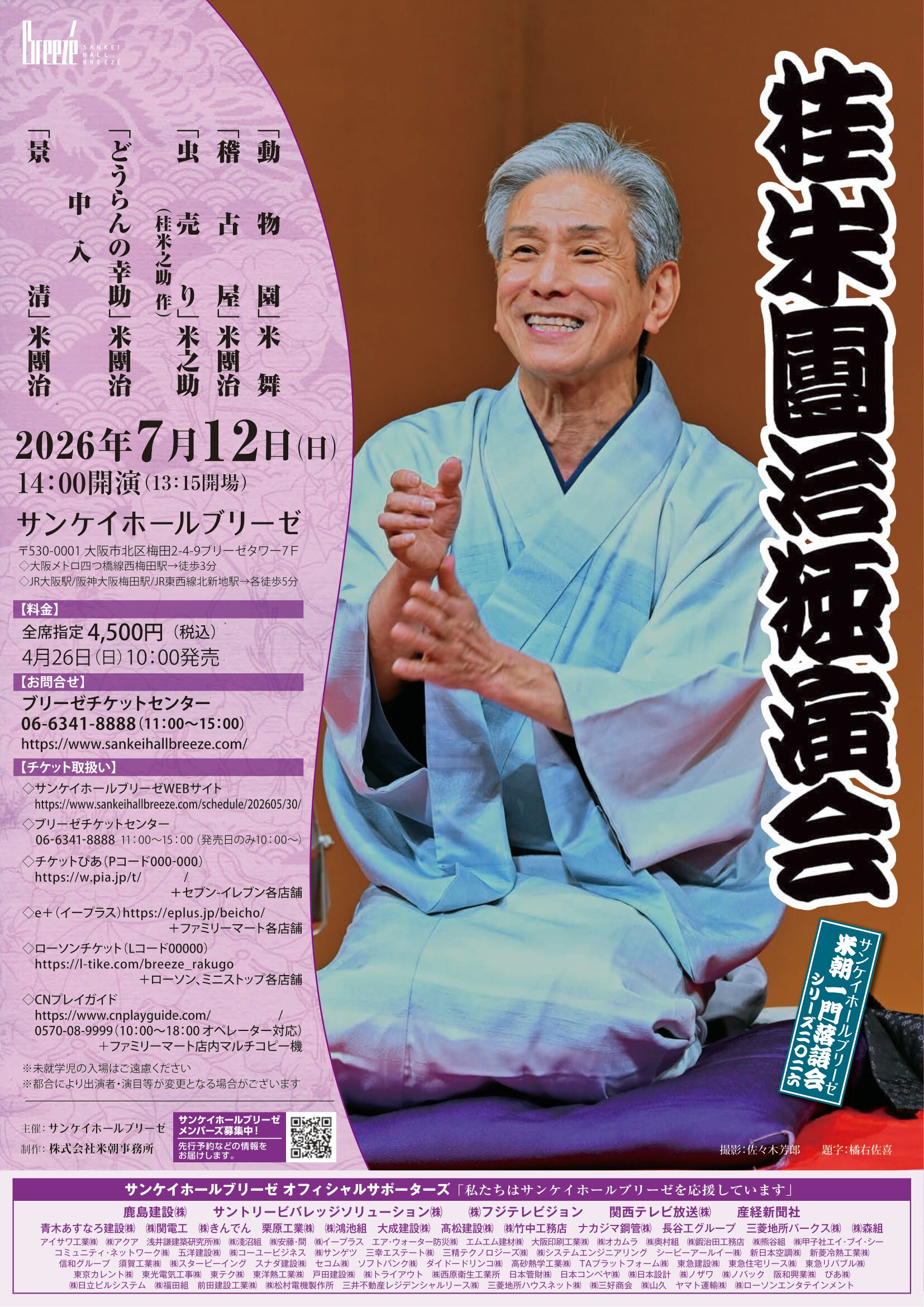 桂米團治独演会/サンケイホールブリーゼ/2026.7.12 イベント詳細 日付: 2026年7月12日(日) 14:00 住所: 〒530-0001 大阪府大阪市北区梅田2丁目4−9 7F タグ: サンケイホールブリーゼ チケットはこちら